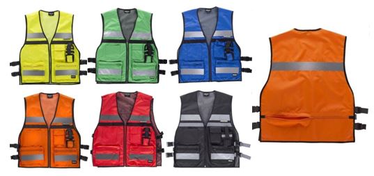 100% Poliéster 180 grs./m² Normativa: EN ISO 20471 Chaleco en tejido Oxford y cintas reflectantes en pecho y espalda. Cierre de cremallera. Hebillas regulables laterales. Forro interior de rejilla. Sistema de sujeción especial para emisoras. 4 bolsillos y 1 bolsillo trasero con cierre de cremallera.